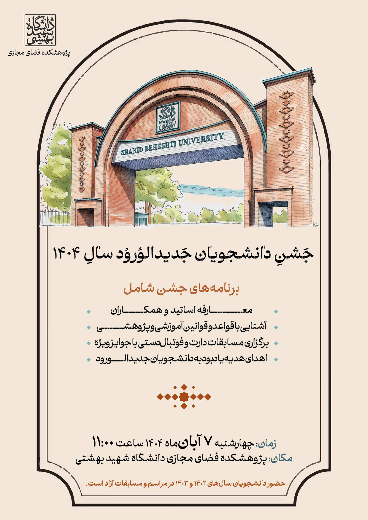 این جشن به افتخار ورود دانشجویان جدید برگزار میشود؛ بنابراین حضور پرشور شما باعث دلگرمی و نشاط جمع خواهد بود. 🌸