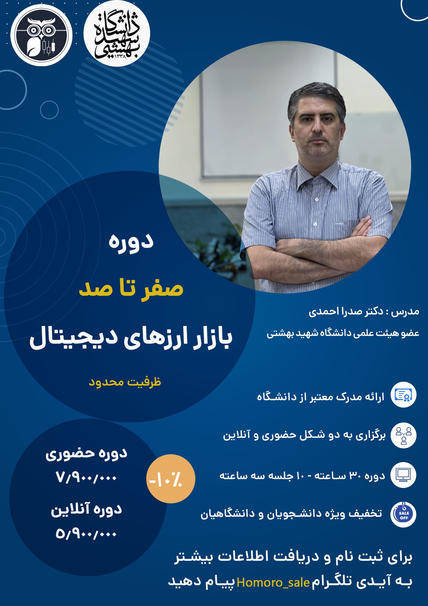 کارگاه مورد نظر توسط جناب آقای دکتر احمدی، استادیار گروه پژوهشی سیستمهای اطلاعاتی پژوهشکده فضای مجازی در روزهای سهشنبه و پنجشنبه به مدت 10 جلسه با هزینه مجموعا 79.000.000 ریال برگزار خواهد شد. شایان ذکر است دانشجویان از تخفیف ویژه برخوردار خواهند بود. جهت کسب اطلاعات بیشتر و ثبت نام میتوانید از طریق آیدی تلگرام Homoro_sale کمیته اجرایی ارتباط داشته باشید.